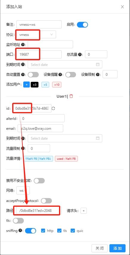 - 开启vmess+ws节点:入站列表>添加入站,如下图设置